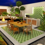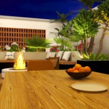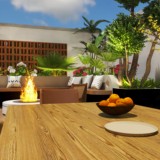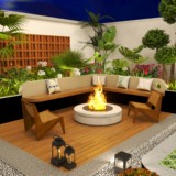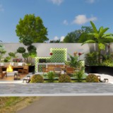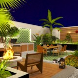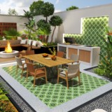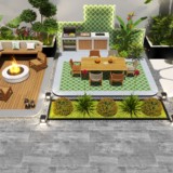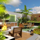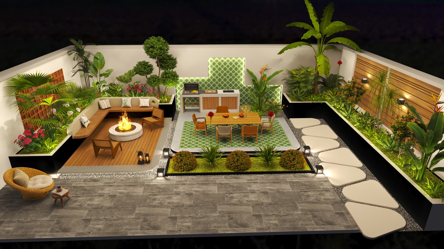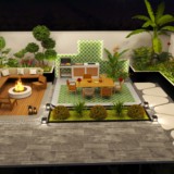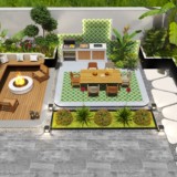该庭院采用现代奶油风设计,柔和色调与木质元素交织,奶白色系家具尽显温馨。划分火坑休闲、用餐、烧烤等区域,热带绿植环绕添生机,地面材质错落有致,绿纹装饰与暖光点缀更显雅致,让亲友相聚时,能在自然与奶油风美学的交融中,尽享惬意休闲时光。
