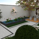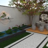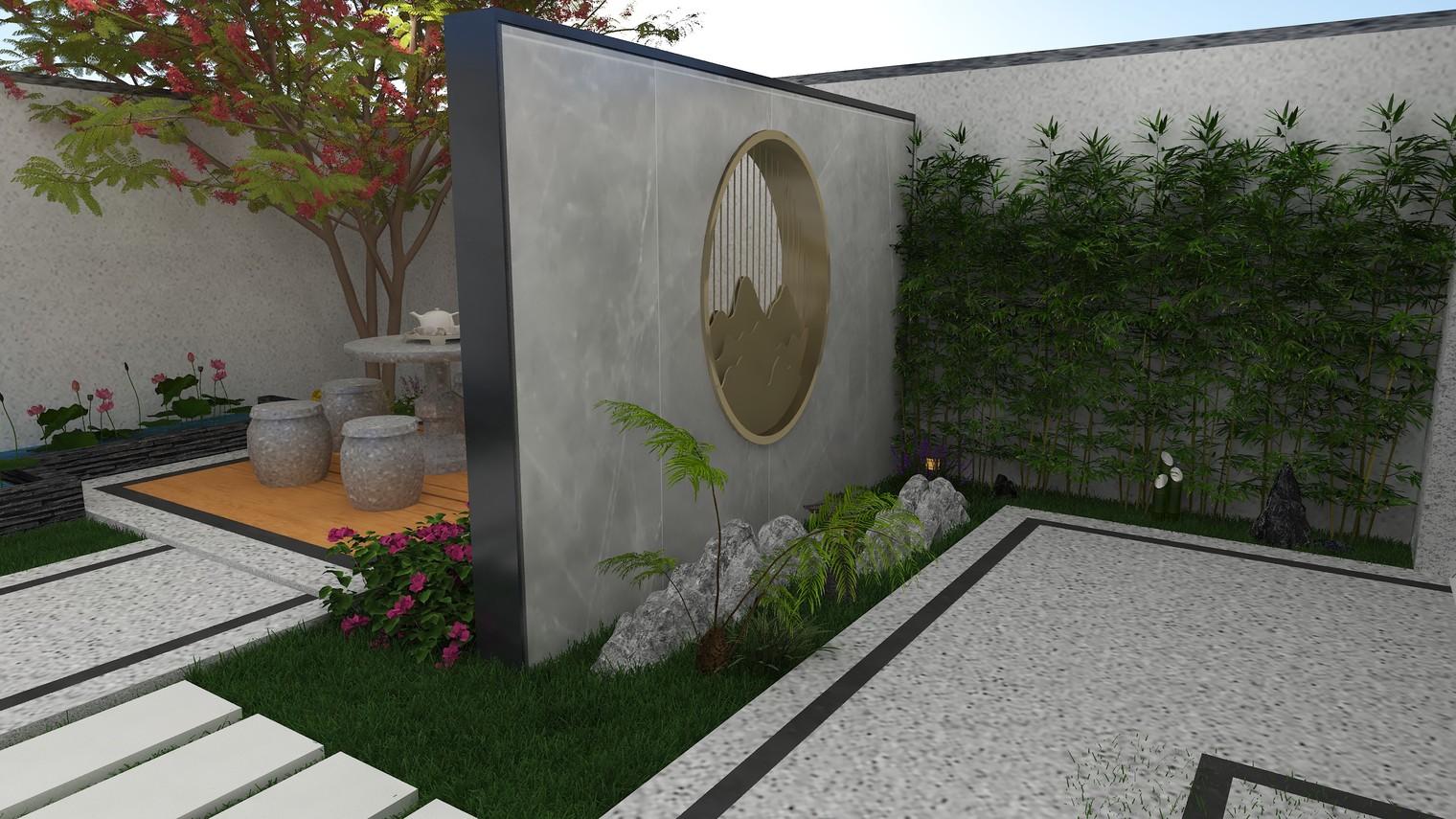 一方天地,古韵悠长。汀步蜿蜒,似在引导着心灵的归处,每一步皆是诗意。石桌古朴,静置于此,可邀友对弈品茗,谈天说地。景墙素雅,勾勒出中式的婉约与深邃。植物高低错落,或枝繁叶茂,或疏影横斜,与汀步、石桌、景墙相映成趣。