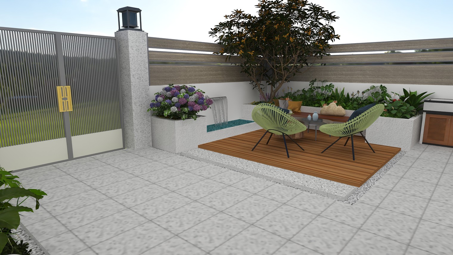 在现代院子里,时光悠然放慢。水景潺潺,似在低吟浅唱,灵动的水花与光影共舞。卡座以简约之姿,静候主人与亲友相聚,柔软的坐垫,承载着欢声笑语。花箱里,各色花卉肆意绽放,芬芳四溢。阳光洒落,微风轻拂,在这里,自然与现代相融,成为心灵栖息的港湾