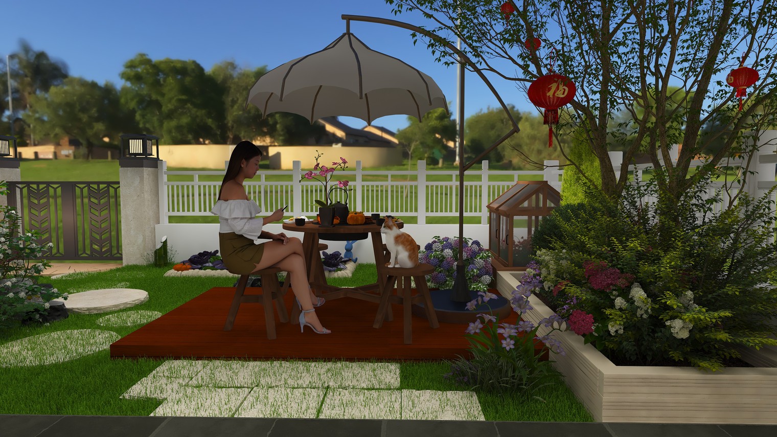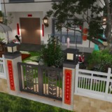 用天蒙蒙亮的手法烘托一日之计在于晨,一年之计在于春的勃勃生机,让业主仿佛置身这惬意美好的小院之中。融入自然元素:引入花草、树木、山石、水景等自然元素,设置小型池塘,种植当地适宜的植物,营造“天人合一”的氛围。
